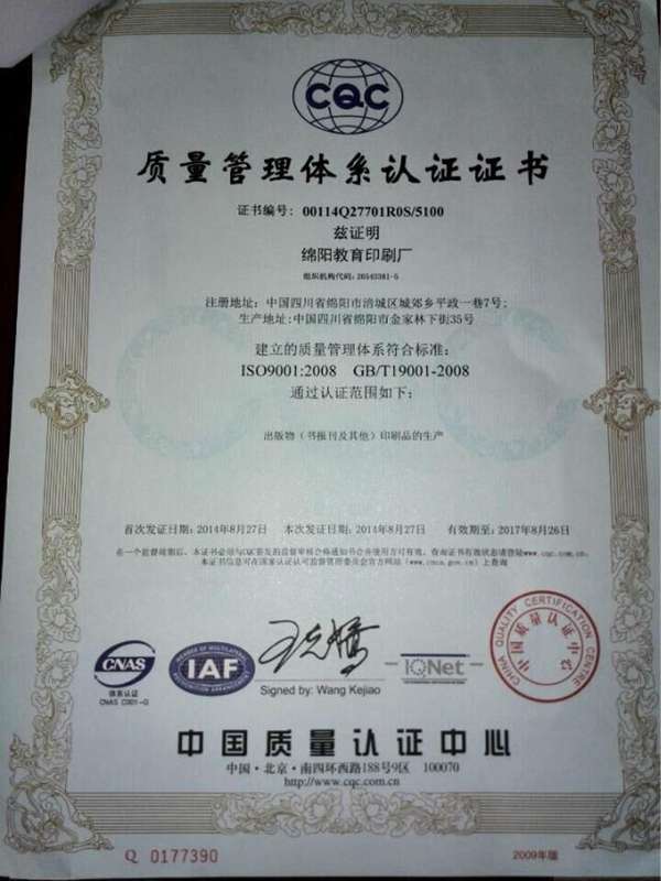 印刷質(zhì)量管理體系認(rèn)證證書