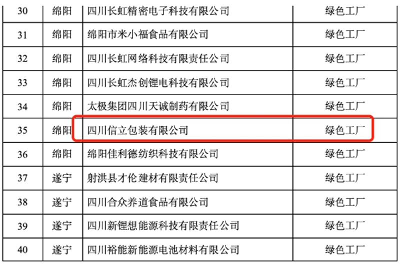 近日,四川省經(jīng)信廳公布了2024年四川省綠色制造名單,位于綿陽工業(yè)園北區(qū)的四川信立包裝有限公司,成功入選省級“綠色工廠”。